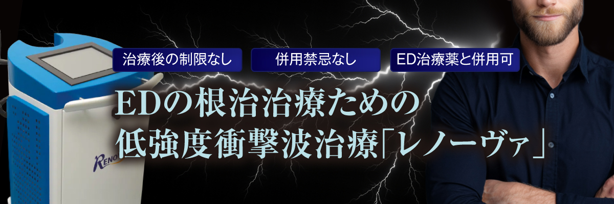 レノーヴァは、ED治療薬との併用治療も可能です。その都度、ED治療薬で対処しながら、レノーヴァで根本的な治療を同時に進 めいていくことができます。また、ED治療薬の効果をさらに高めたい方や、ED治療薬の効き目が弱い方・満足されていない方もレノーヴァとの併用はお勧めです。