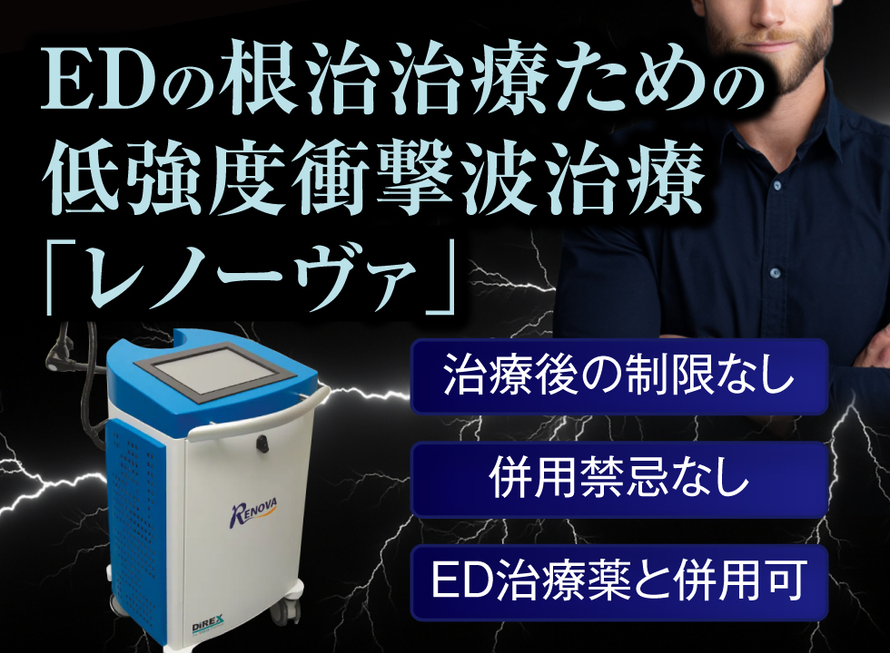 ED治療薬は性行為のたびに服用する対処療法となりますが、対してレノーヴァは根治治療を行うための医療機器です。EDの 原因そのものを改善し、自然な勃起を促す治療方法です。